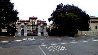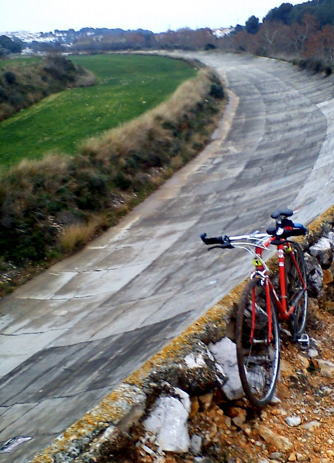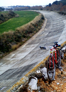 Otro deporte de riesgo: - ¿veis las casetas del fondo? está llena de perros sueltos, ni se os ocurra poneros a dar vueltas en el óvalo!!! He estado tentado en tirar la bici para abajo y salir por detrás pero... no me he atrevido por los perros. Qué pena de lugar y mirad si podría ser un lugar para ir a rodar en invierno en bicicleta, un velódromo de 2 kms!!!
